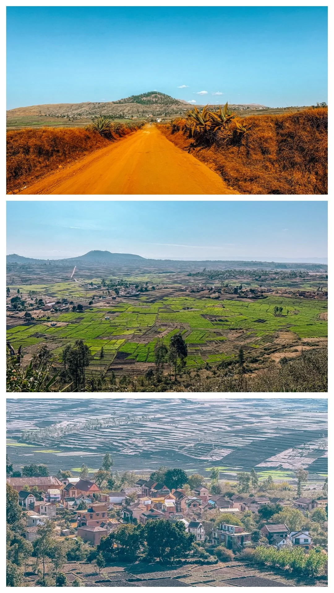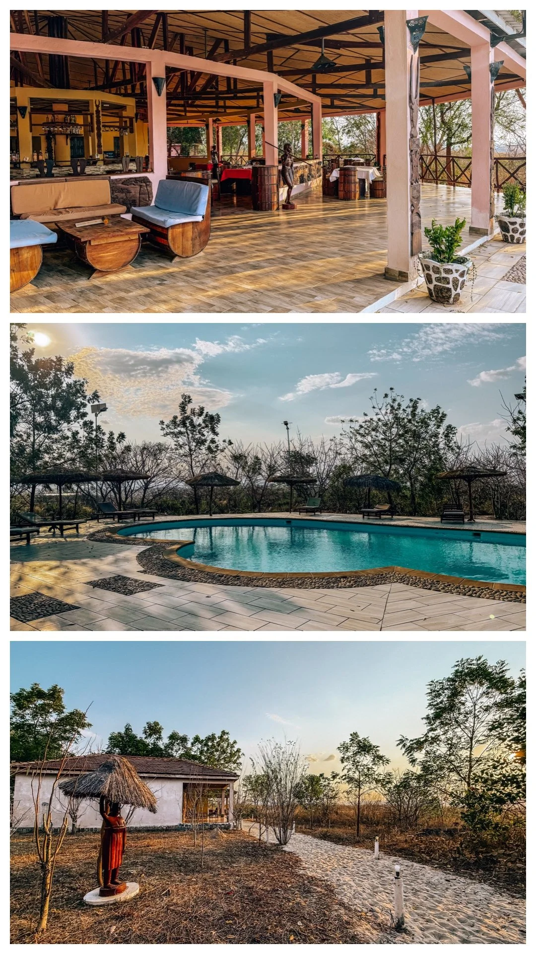 After a little hike through the pine forest to see volcanic Lake Tritriva — with its emerald waters and views over the surrounding rice fields — we carried on along the dusty road to Hotel Eden du Tsiribihina. It’s set out on the savanna and gave me proper bush/safari vibes, especially at sunset. This spot is basically the gateway to Miandrivazo, where people launch trips down the Tsiribihina River and head off toward Tsingy.