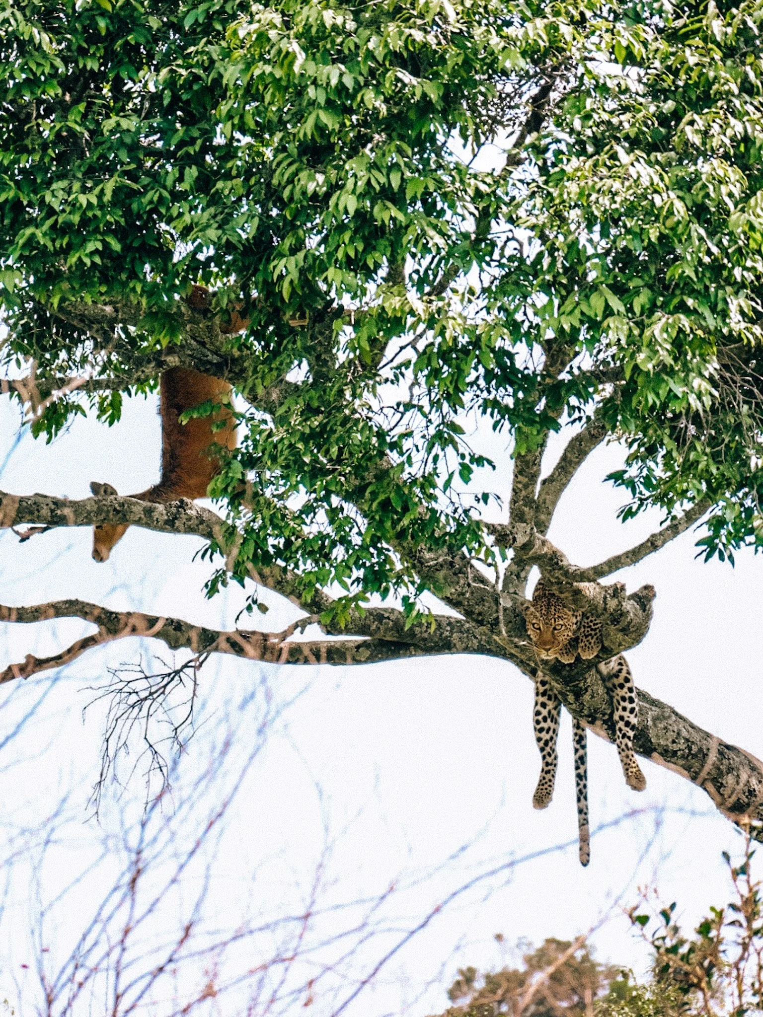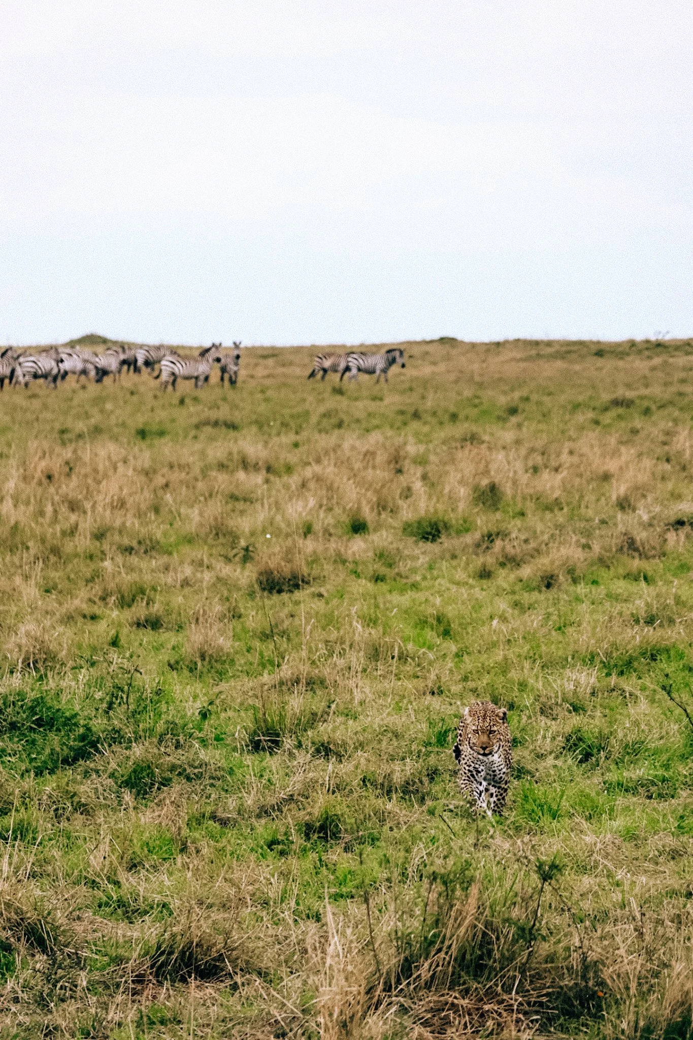 And the kitty-cat extravaganza didn’t stop there! We had an unbelievable leopard sighting with a perfect angel leopardess named Luluka, who I am now officially obsessed with. She crossed the plains, moving swiftly past herds of gazelles and zebras, always choosing to intersect with our vehicle along her path (I think she loves me too 🥹). We had another INSANE sighting of a mama leopard and her cub perched on a branch, her impala kill dangling poetically off to the side—one of my favourite wildlife photos I’ve ever taken. We even spotted a cheetah to top it off! Hats off to our driver, Masai Mark, for always getting us perfectly positioned and hustling to deliver the sightings we desperately wanted!